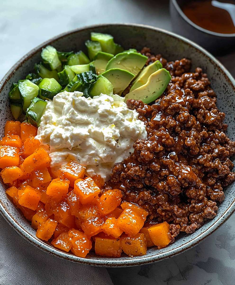 Un bol savoureux de buf haché aux légumes, sucré et salé, idéal pour un repas équilibré. Préparez une base de riz ou quinoa, garnie d’un mélange de buf, poivrons, carottes et courgettes, le tout assaisonné de miel et de sauce soja. Servez avec des feuilles de laitue pour une touche de fraîcheur. Parfait pour un dîner rapide et délicieux.
